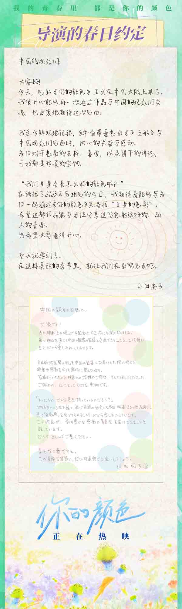 “唱响青春”版海报则呈现了窦子、小君、路易三人在校园庆典舞台上的高光场面,尽兴自由的演奏中,灯光聚焦在三位乐队成员的身上,少女少年面颊上流下的汗珠都在闪闪发光,洋溢在每位角色脸上的兴奋和享受,将观众拉入青春与音乐的绚丽世界。而在上映当日,山田尚子导演也特别为内地观众送上一封手写信,表示:“希望通过《你的颜色》和大家分享这份色彩缤纷的、动人的青春。”并邀请观众在跨越了2723天后再次“相会”的此刻,一起来到影院寻找“自身的色彩”。